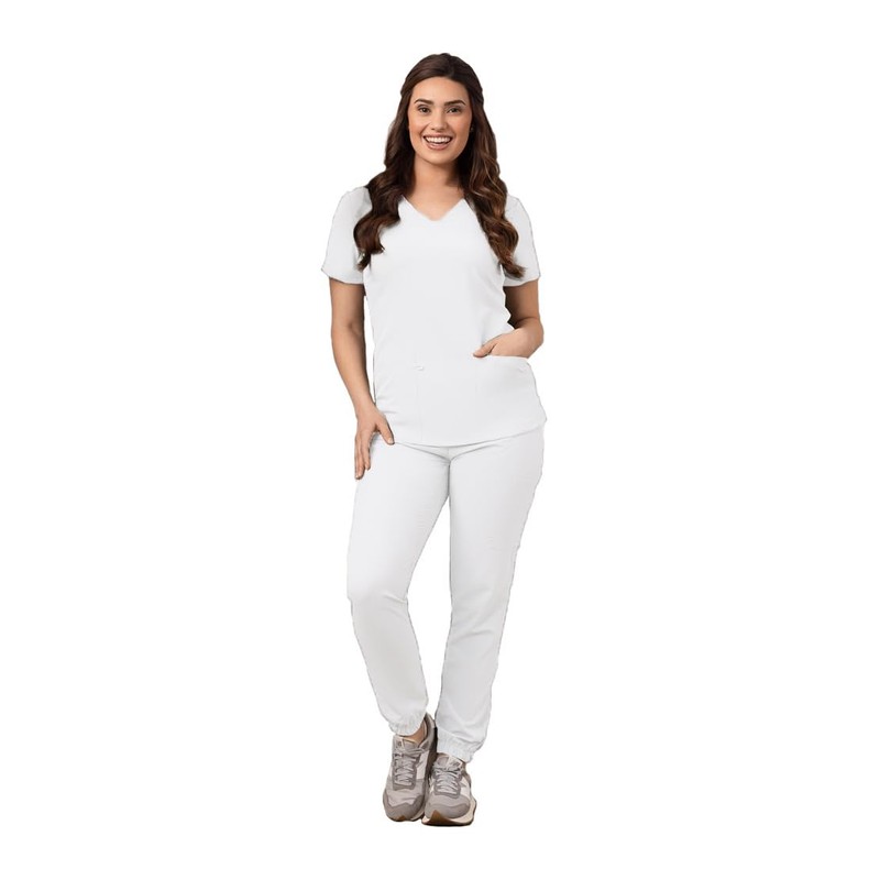 - Características útiles: ideal para el campo médico, la parte superior con cuello en V ofrece un lazo elástico para tu tarjeta de identificación u otros accesorios, aberturas laterales y un bolsillo para teléfono celular. El pantalón deportivo de ajuste delgado cuenta con un dobladillo elástico y una cintura elástica completa y cierre de cordón completo que se mantiene segura en la cintura. Viste este pantalón deportivo hacia arriba o hacia abajo, perfecto para entrenar o descansar en tus días libres.
