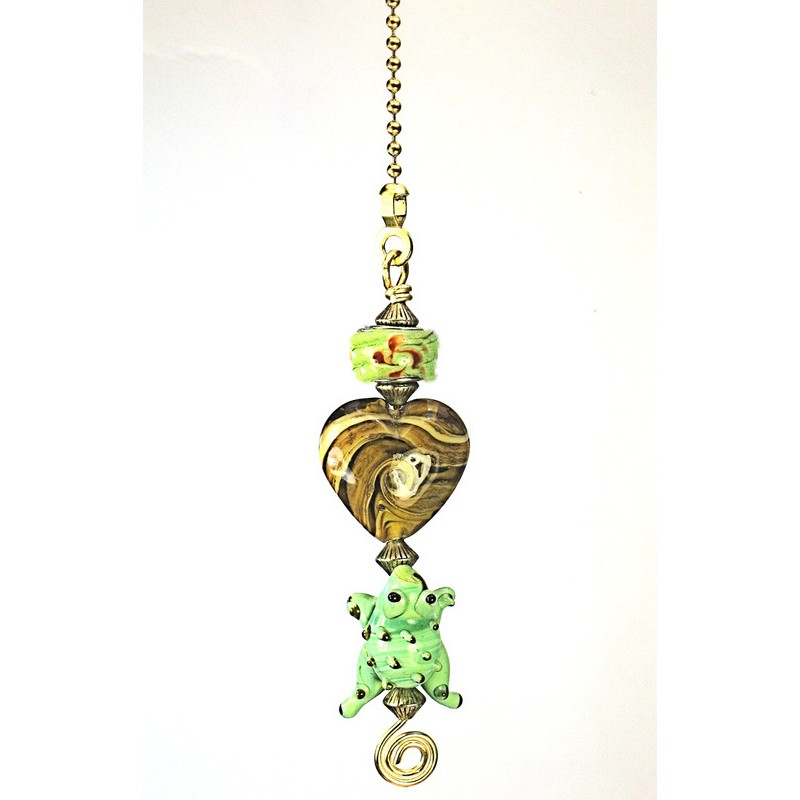 - Swirled Amber Heart and Green Tree Frog lampwork glass ceiling fan pull