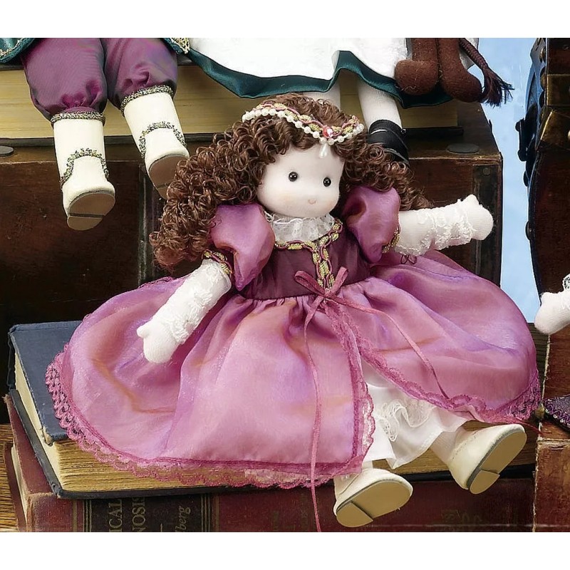 She is a soft sculpture doll with a key windup music box (under her dress). Her sitting height is 5" and she plays the "Romeo & Juliet." If she could (she can't) stand up, she would be about 7.5" tall.