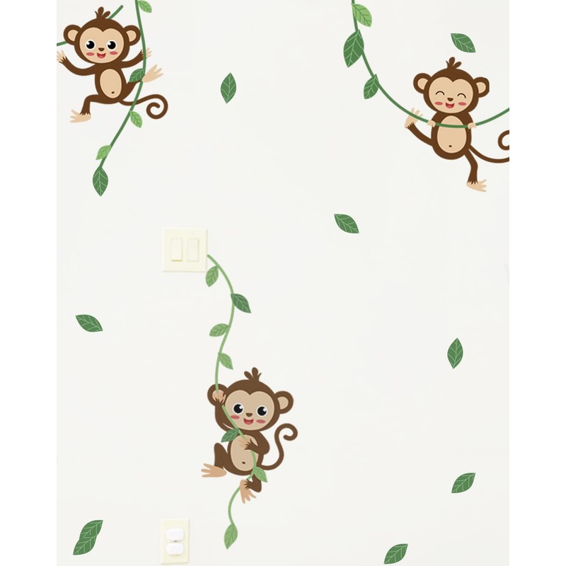 - 🐵 WHAT’S IN PACKAGE - includes 3 sheet of Cute Jungle Monkeys wall decals. Pre-cut wall stickers and green vines wall decals: the size of the monkeys is about 10.2". To prevent curling after peeling and sticking, put them under the weight and flatten them before work, and suggest to finish the wall mural by two people.