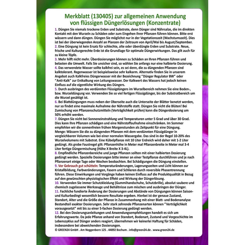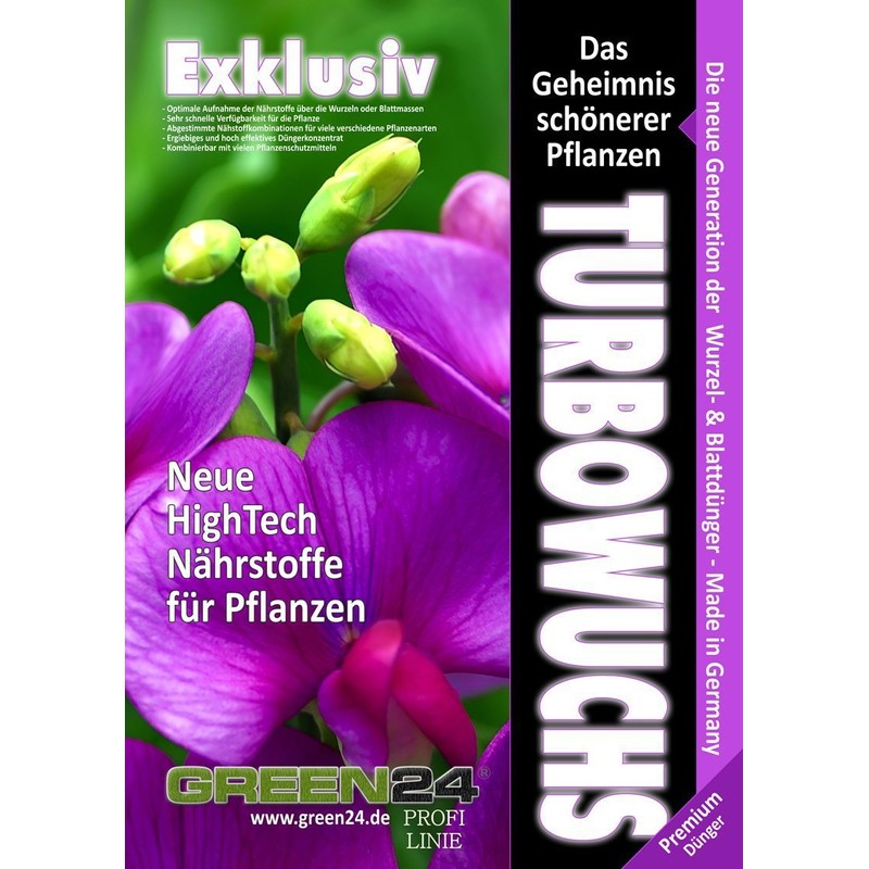 ProduktbeschreibungenÜber 30 Jahre Erfahrung und Kontinuierliche Weiterentwicklung garantieren Ihnen einen perfekten Dünger. Die Dünger der GREEN24 PROFI LINIE werden durch Gärtner der verschiedenen Fachbereiche und nach neuesten Erkenntnissen in der Anzucht und Kultivierung entwickelt und produziert. Jeder Dünger enthält ausschließlich hochwertigste Rohstoffe und Chelate, die eine optimale Nährstoffaufnahme garantieren. Die GREEN24 PROFI LINIE ist ein Gemeinschaftsprojekt ambitionierter Gärtner und enthält jahrzehntelanges Fachwissen aus den verschiedenen Fachrichtungen im Gartenbau. Es handelt sich ausschließlich um beste mineralische NPK Dünger-Lösungen (flüssige Konzentrate). Nur eine ausgewogene Versorgung einer Pflanze garantiert üppiges und gesundes Wachstum. Mit unseren professionellen Dünger und Stärkungsmitteln haben Sie lange Freude an Ihren Pflanzen. Gesunde Pflanzen sind zu dem weniger anfällig gegen Schädlinge und Krankheiten. Wir bieten vom Flüssigdünger, wasserlöslichen Düngern, bis zum Langzeitdünger verschiedene Angebote.Gebrauchsanweisung[INF] Instructions for use include diluting the concentrate and applying it to plants with the dosage determined by the type and condition of the plant, as per the product label.WarnhinweiseHinweis: Außer Reichweite von Kindern aufbewahren. Bei Haut- oder Augenkontakt sofort mit Wasser abspülen.