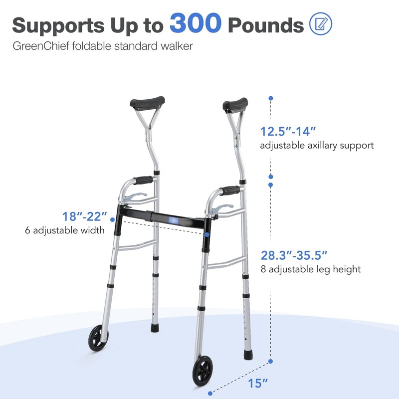 GreenChief Walkers for Seniors, Foldable Standard Walker with Adjustable Width, Folding Walker with Arm Support, 2 Wheels Walker for Elderly Handicapped Disabled (300LB)
