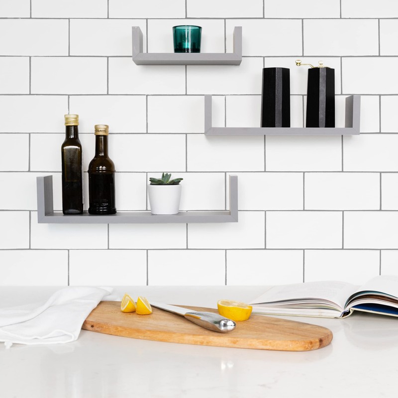 These U shelves are functional and attractive alike. It matches almost every decor and is great for your kitchen, dining room, living room or office. Use it as a practical shelf or to display collectibles, photos etc. or decorative items. It's easy to mount and comes with all necessary mounting hardware. It measures; Large-16.85 x 4 x 4. Medium-12.87 x 4 x 3.5. Small-9 x 4 x 2.83 inches.