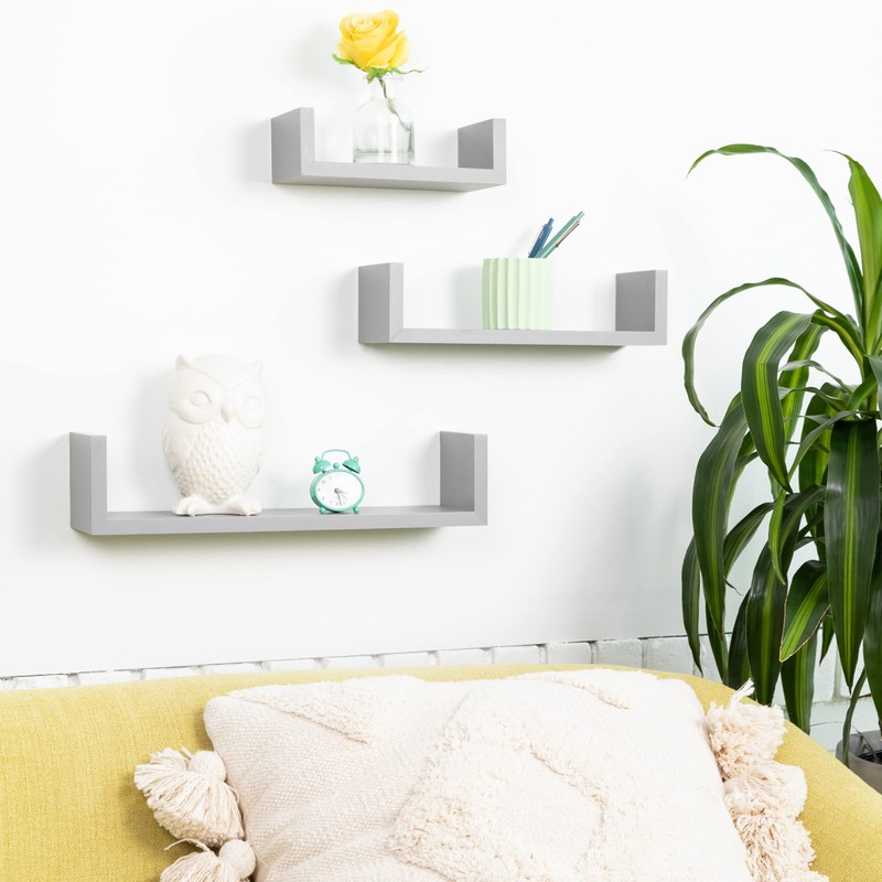 Greenco Set of 3 Floating “U” Shelves, Easy-to-Assemble Floating Wall Mount Shelves for Bedrooms and Living Rooms, Grey Finish