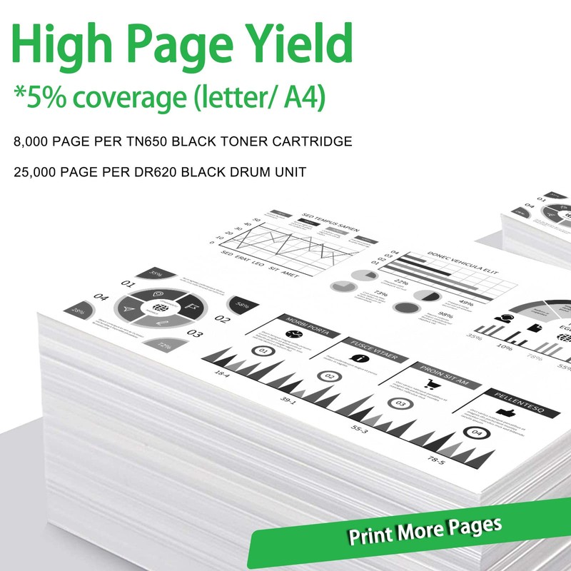 - Page Yield: Up to 8,000 pages per TN650 black toner cartridge / 25,000 pages per DR620 drum unit (based on 5% coverage of Letter size Paper). Actual toner yield varies with usage, graphics printed and environmental conditions.