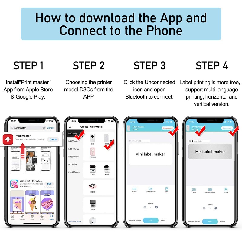 - Steps for App Download and Connect - Search "Print master" on App Store or Google Play to get the app or please scan the QR Code to download the App->Open the App and Turn on D30S printer->Choose printer model D30S from menu and then click “unconnected” button at the top of the screen -> Match and connect Bluetooth via the app. Note: Please select the correct print template to match the label size before edit.
