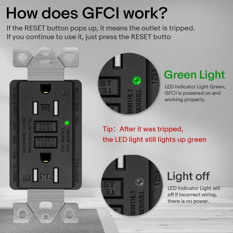 Warning Tips: The GFCI socket needs to be tested whether it can work normally before using. The Green Light indicates that the wiring is correct.1.plug the night light into the outlet, and the light should be on. 2.Press the "Test" button, the” Reset“ button will pop up and the night light will turn off. If you press the test button and the reset button pops up but the night light still on, it indicates that the leakage protection is faulty. Please replace the socket.