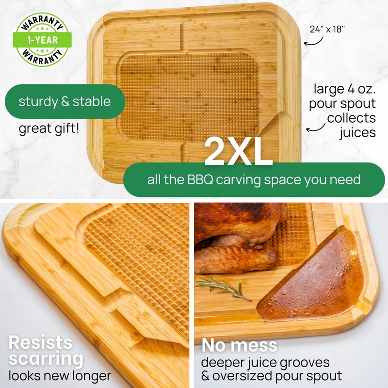 • IMPRESS GUESTS & PREP LIKE A PRO - This giant, extra large cutting board is impressive in its appearance and you can use it to carve all of your favorite cuts. It's a specially designed cutting board for meat! Use it for many meal preps at once or prepare one big meat platter for the family using this bbq cutting board for meat. It's beautiful and washes easily, making clean-up quick! This turkey cutting board is a must-have in any carving set and will be your best friend every time you feast.