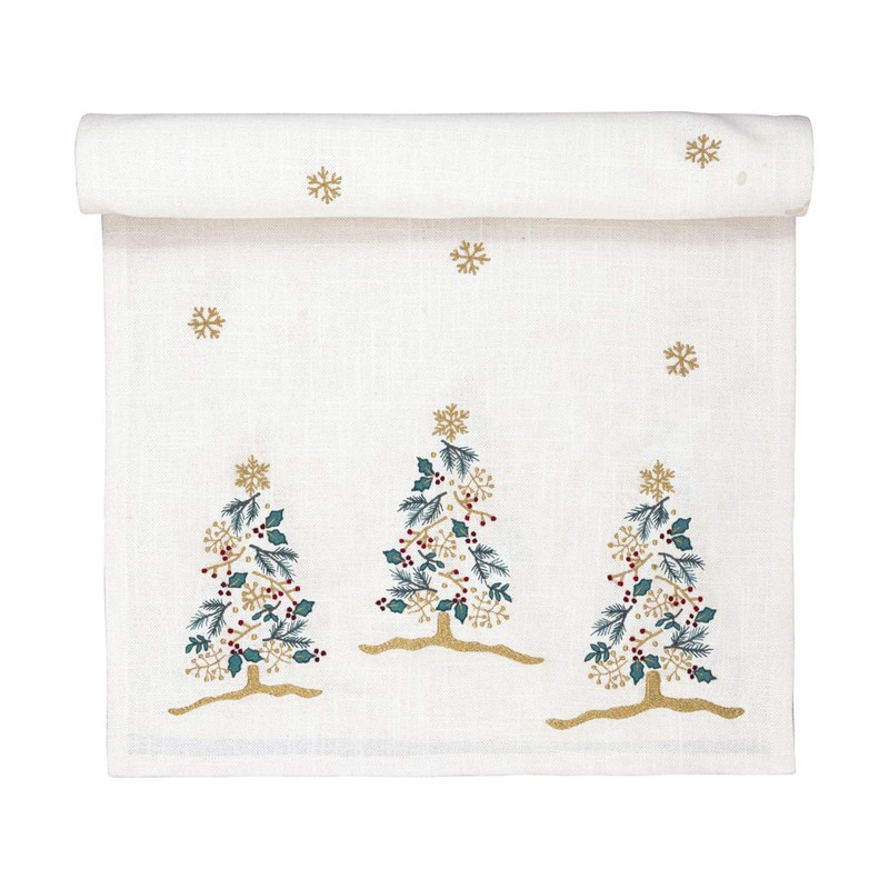 - White table runner with embroidered Christmas trees