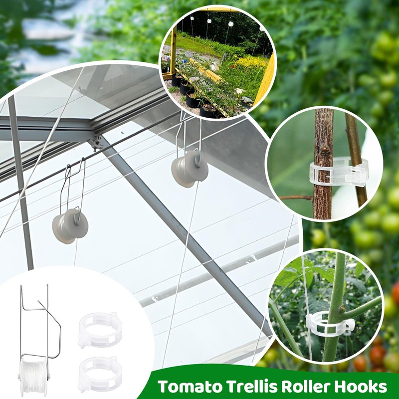 Greenhouse Trellising Kit,Tomato Hooks with String,10 PCS Plant Roller Hooks with 100 PCS Tomato Support Clips,Flower Vine Twine Crop Trellis Kit for Tomato,Plant,Greenhouse