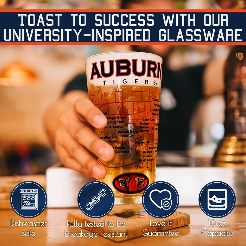 - Officially Licensed Auburn University Drinkware - Enjoy a cold beverage with these school spirit pint sets. Each set contains 2 beer glasses featuring the university's full color logo and an authentic campus map with key landmarks included!