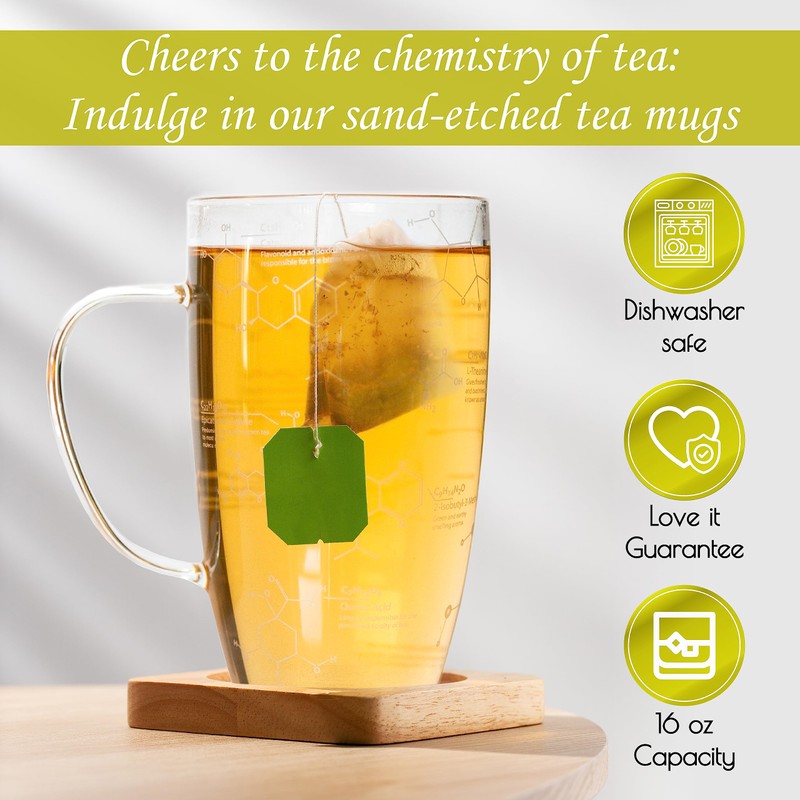 - Science themed sand etched clear tea mug: Each glass features a detailed look at the molecules found in tea, with a short explanation about how each molecule contributes to your favorite caffeinated beverage. Perfect for science and chemistry lovers. Glass sets are carefully packed in an elegant gift box and chosen to make a lasting impression!