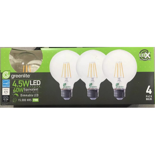 Greenlite 4 Pack LED Deco G25 Light Bulb 40W=4.5W 2700K DIMMABLE E26 Clear Glass