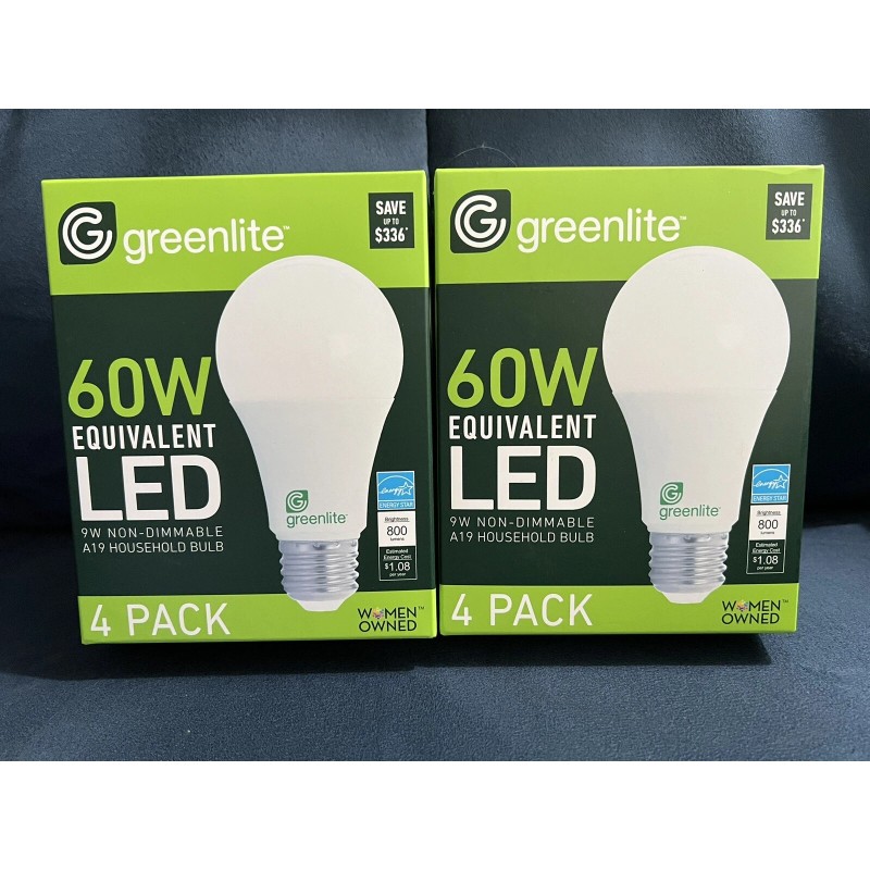 NEW Women Owned: Greenlite LED 60W A19 Med Base Household Bulbs | Two 4 Packs | 8 Bulbs Total.
