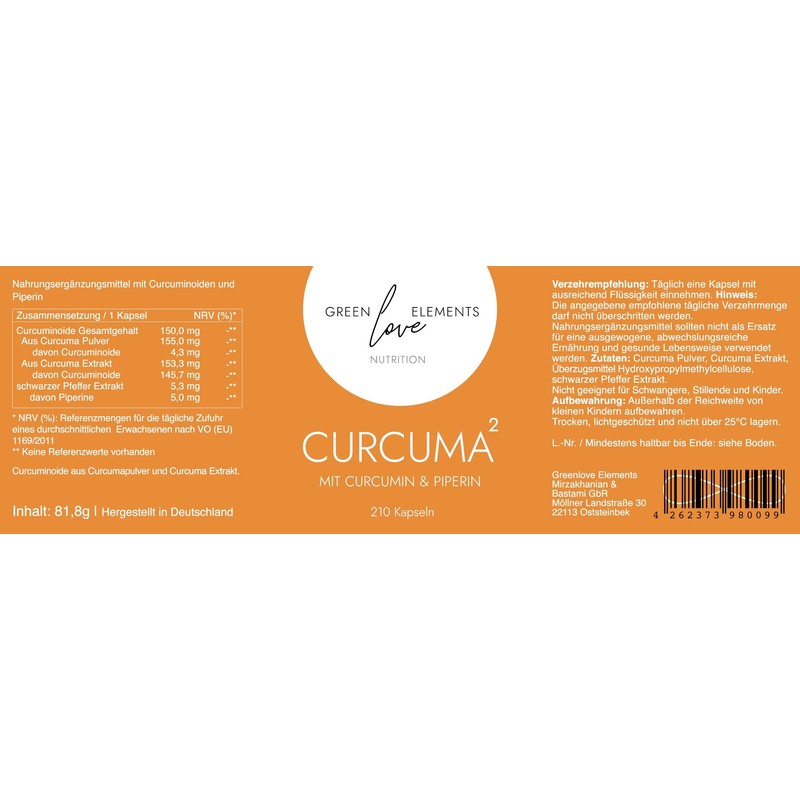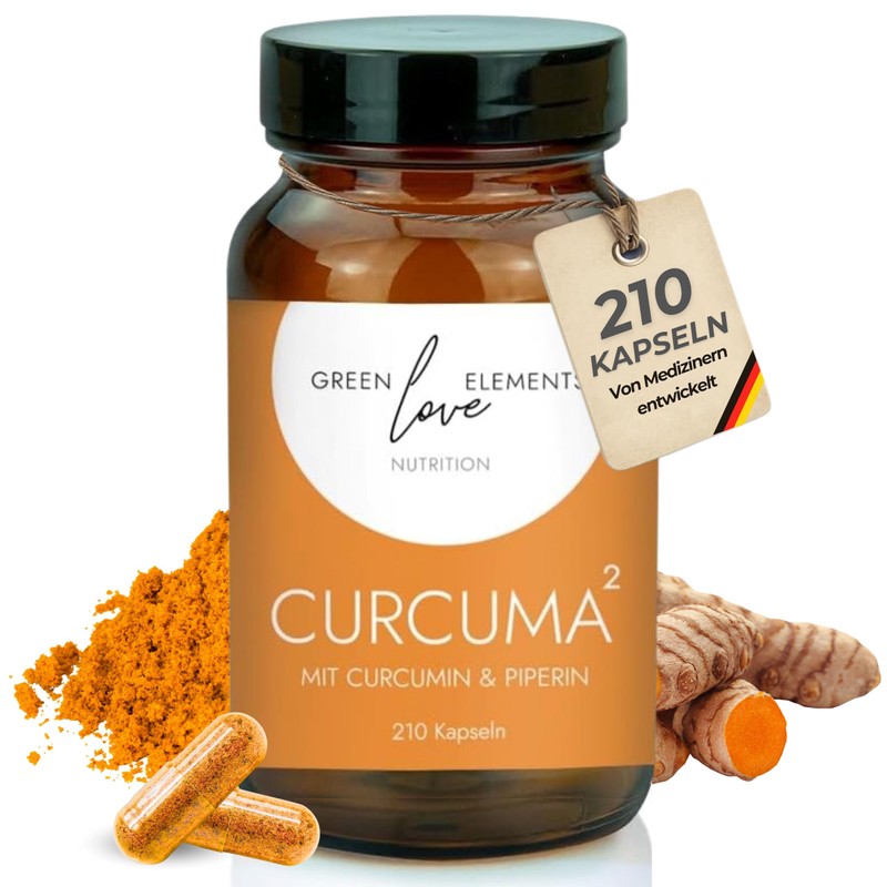 Greenlove Elements Curcuma Kapseln Hochdosiert C Kurkuma-Pulver & Kurkuma-Extrakt mit 95% Curcuminoiden & Piperin C 210 Kapseln Curcuma fr 7 Monate C Laborgeprft, Vegan & Made in Germany