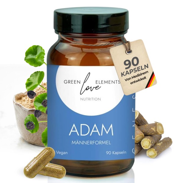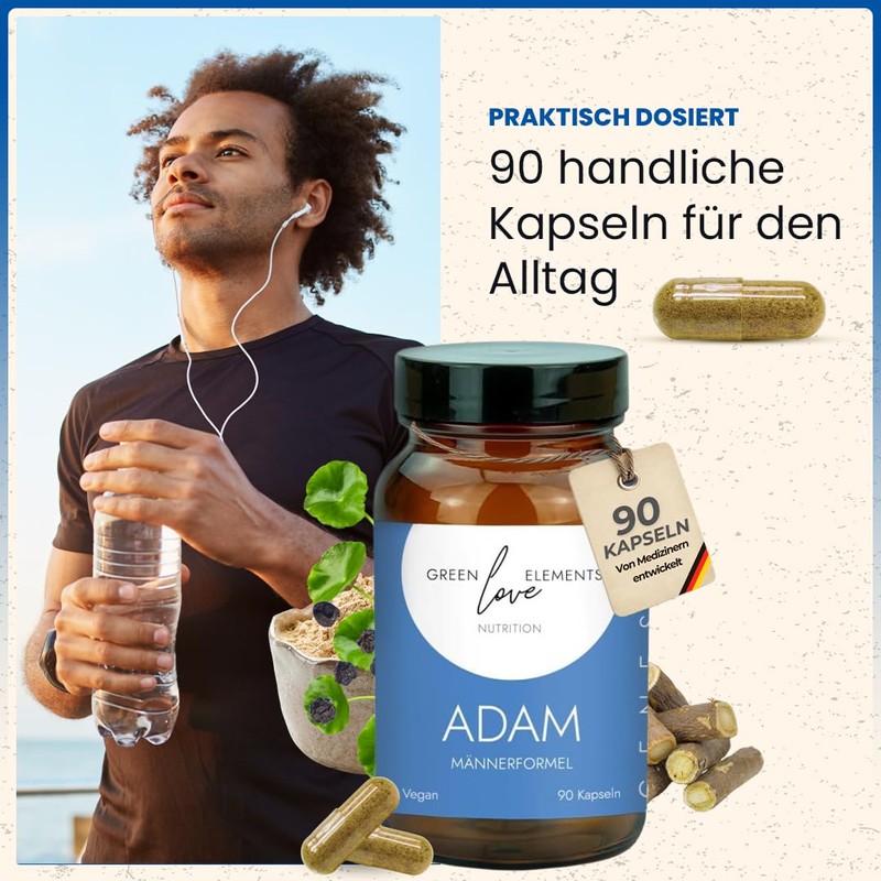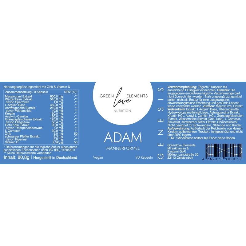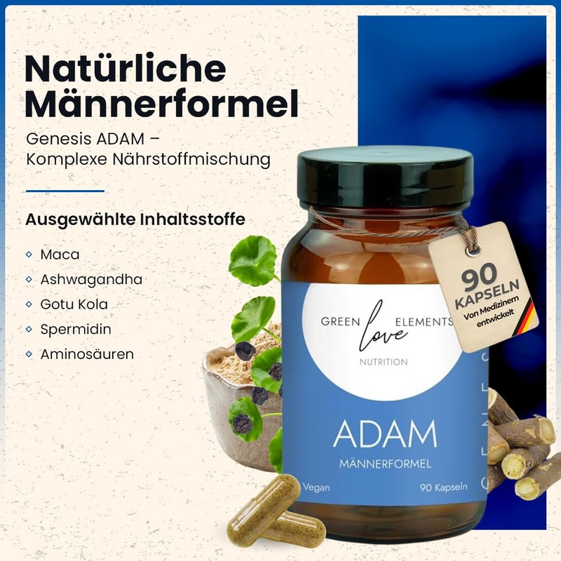 Greenlove Elements Genesis ADAM M?nner-Komplex - M?nnerformel mit Maca, Ashwagandha, Gotu Kola, Spermidin, Aminos?uren & mehr C 90 vegane Kapseln C Energie, Immunsystem & Wohlbefinden - laborgeprft C Made in Germany