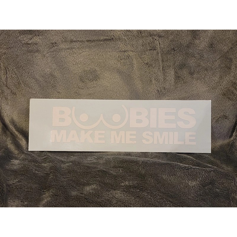 Boobies make me smile vinyl decal.. 2 1/4" x 8 1/2" . Greenstar outdoor vinyll. Available in white, black, Lime Green,Silver, Blue,Yellow, Gray, Red and Pink. Free shipping. Great for vehicle windows. Man cave or garage fridge, tool boxes etc, not for use on walls. Message me if you are looking for a different color otherwise it will be sent in the color shown in the photo.