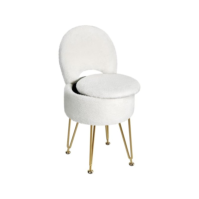 GREENSTELL Small Vanity Stool Chair with Storage and Folding Back, 13" x 13" x 17.7" Faux Fur Soft Ottoman for Teenager, 4 Metal Legs with Anti-Slip Feet, Furry Padded Seat for Makeup, Bedroom, White