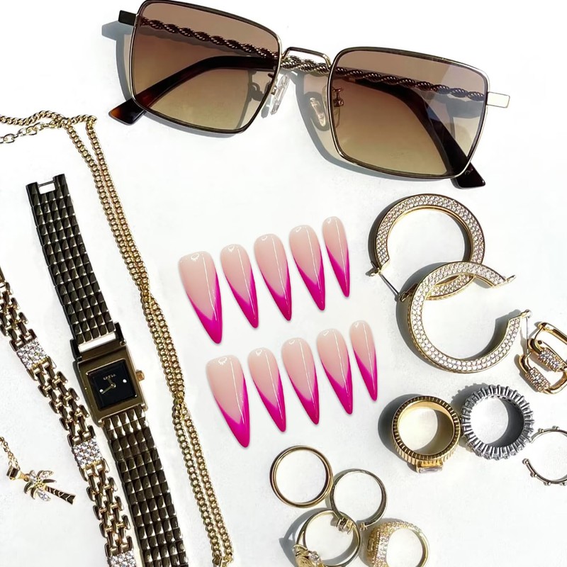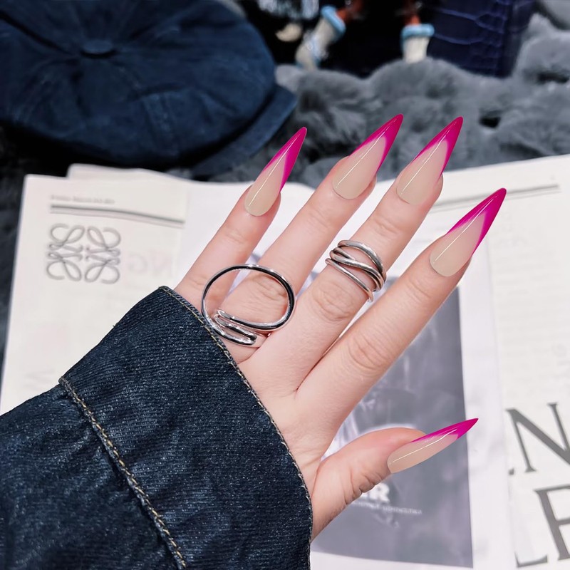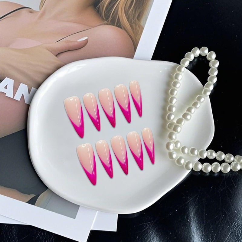 - STYLISH DESIGN: Long stiletto press-on nails featuring an elegant pink V-shaped French tip design with a stunning nude to hot pink ombre gradient effect