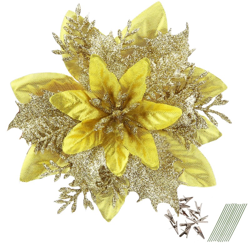 - Package Include: 12 pcs Christmas glitter poinsettia flowers + 12 pcs metal clips + 12pcs stems