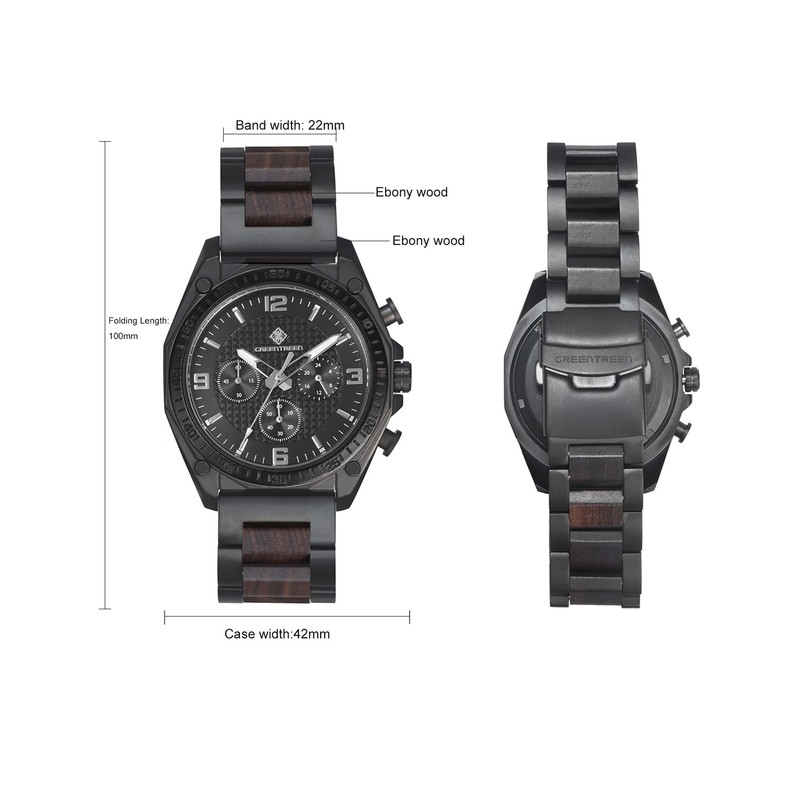 GREENTREEN Men's Wooden Watch Chronograph for Men: Waterproof Wooden Watch - Analogue Watch with Date for Everyday Hiking Jogging - Quartz Watch for Husband Father Son, black, Classic