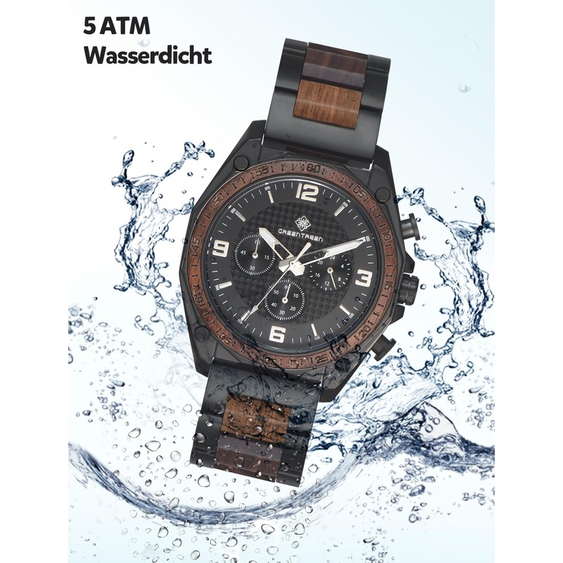- Leisure and business style: the metal bracelet has wood incorporated which makes it very noble and very elegant. Stylish and elegant watch that can be worn for any occasion. Whether you wear it in everyday life or during outdoor activities such as hiking, jogging, walking or travelling, whether at work, leisure or at a banquet, this casual watch is just the thing for you. 5ATM waterproof in daily life.