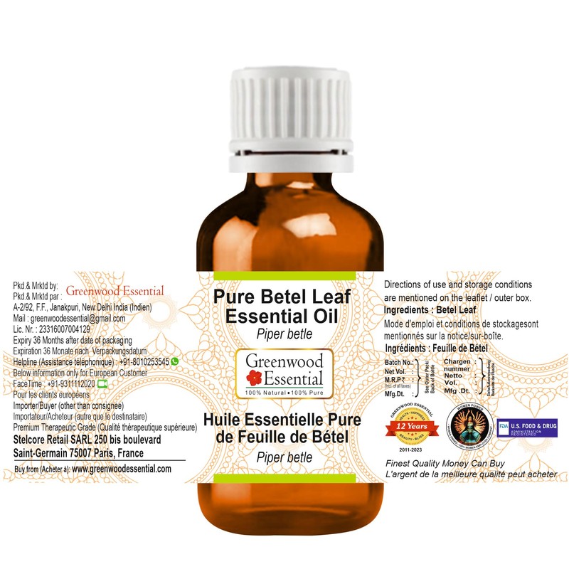 - Quantity - 10ml (0.33 oz), Container Type - High Quality Amber Glass Bottle designed to preserve potency. Method of Extraction - Steam Distillation, Botanical Name - Piper betle, Daily skin care Regimen, Lightweight, Non-greasy, Non-sticky, For all seasons