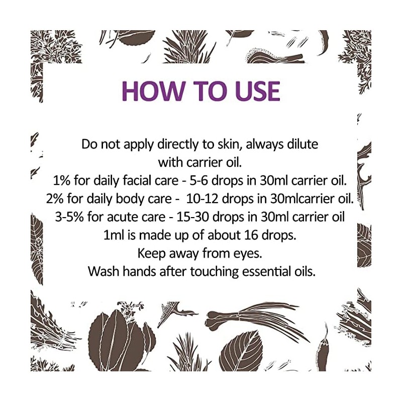 - Use: do not apply directly to the skin, always dilute with carrier oil. 1% for daily facial care, 5-6 drops in 30 ml carrier oil. 2% for daily body care, 10-12 drops in 30 ml carrier oil. 3-5% for acute care, 15-30 drops in 30 ml carrier oil. 1 ml consists of about 16 drops.