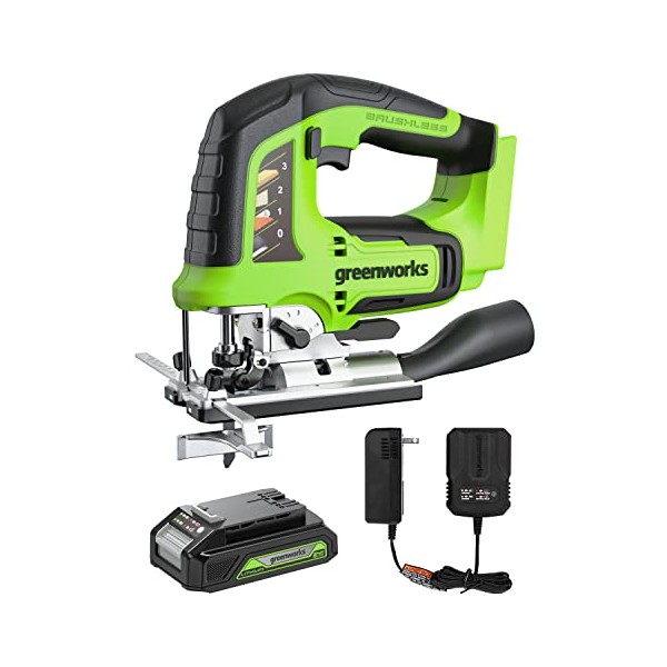 Greenworks 24V Jigsaw Brushless Cordless - 3000 SPM, 4 Orbital Settings, Variable Speed, with 2AH Battery and 2A Charger, 6PCS Blades for Wood & Metal