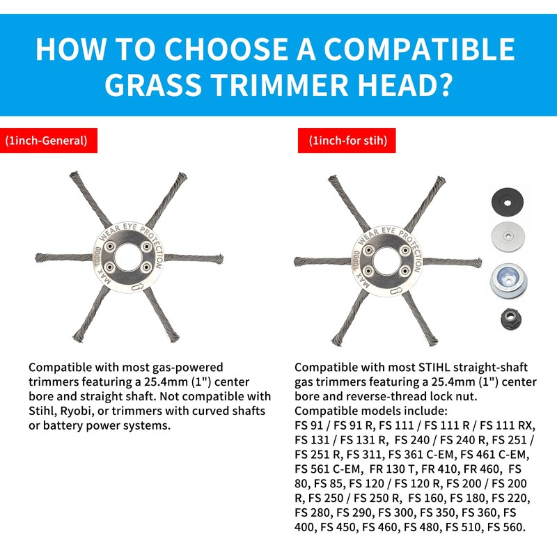 Compatible with most STIHL straight-shaft gas trimmers featuring a 25.4mm (1") center bore and reverse-thread lock nut.