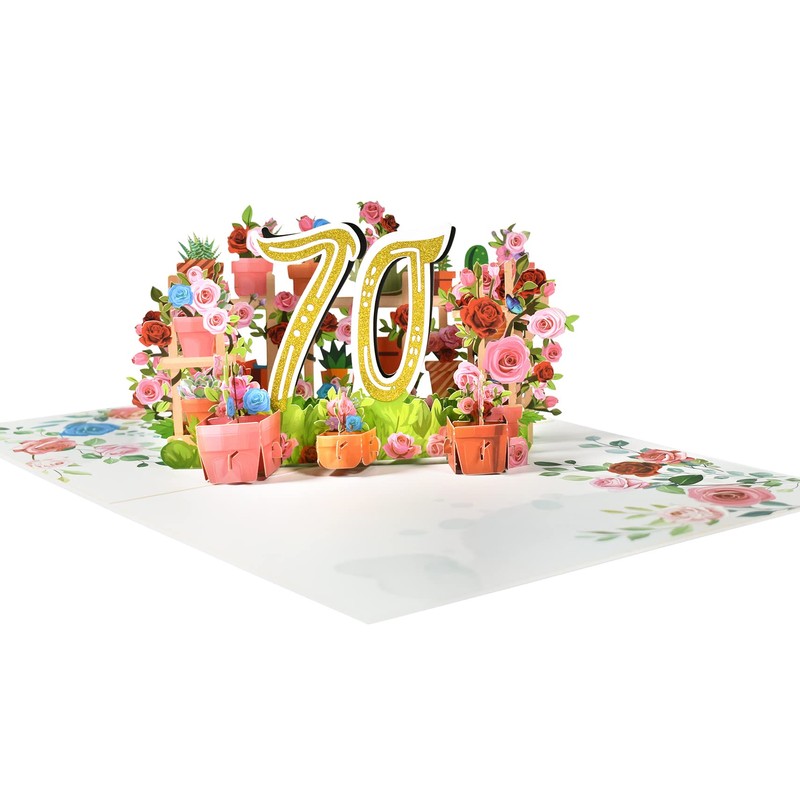 - 70th Birthday Pop Up Card: This 70th birthday pop up card is mini-masterpiece displays a beautiful 3D pop-up design. It can be popped up of features “70” with flowers and boxes.Makes your birthday or anniversary party’s decorations stand out.