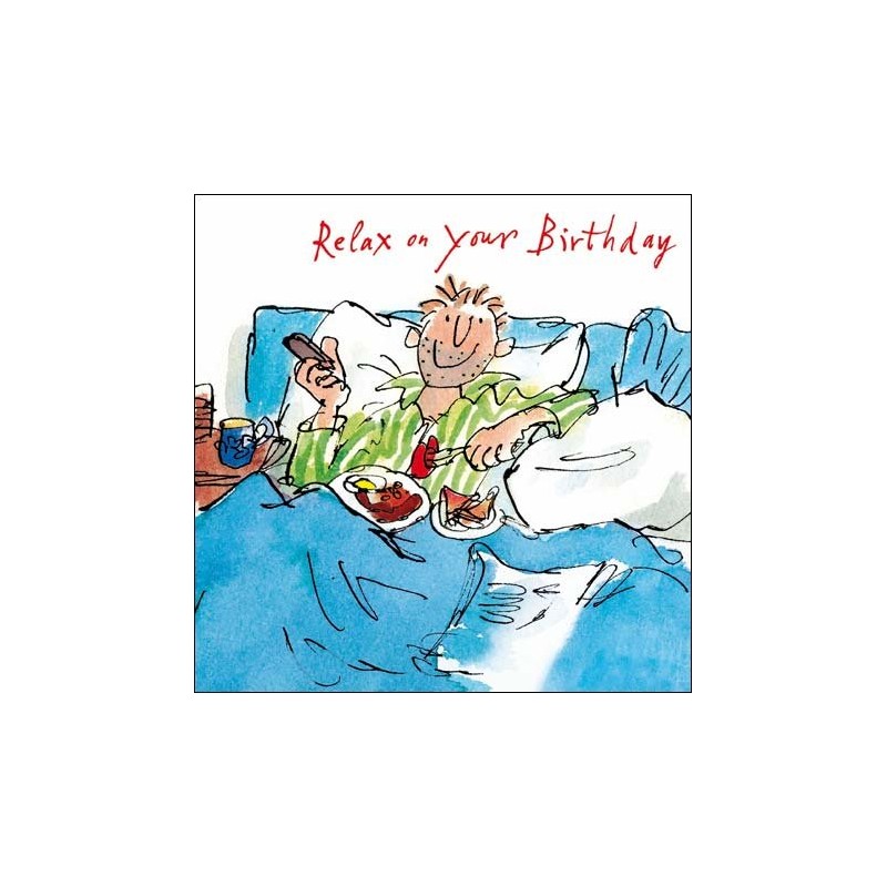 - ARTISTIC DESIGN: featuring a colourful illustration of a man eating breakfast in bed along with the words "Relax on your Birthday". The card comes with a coordinating envelope.