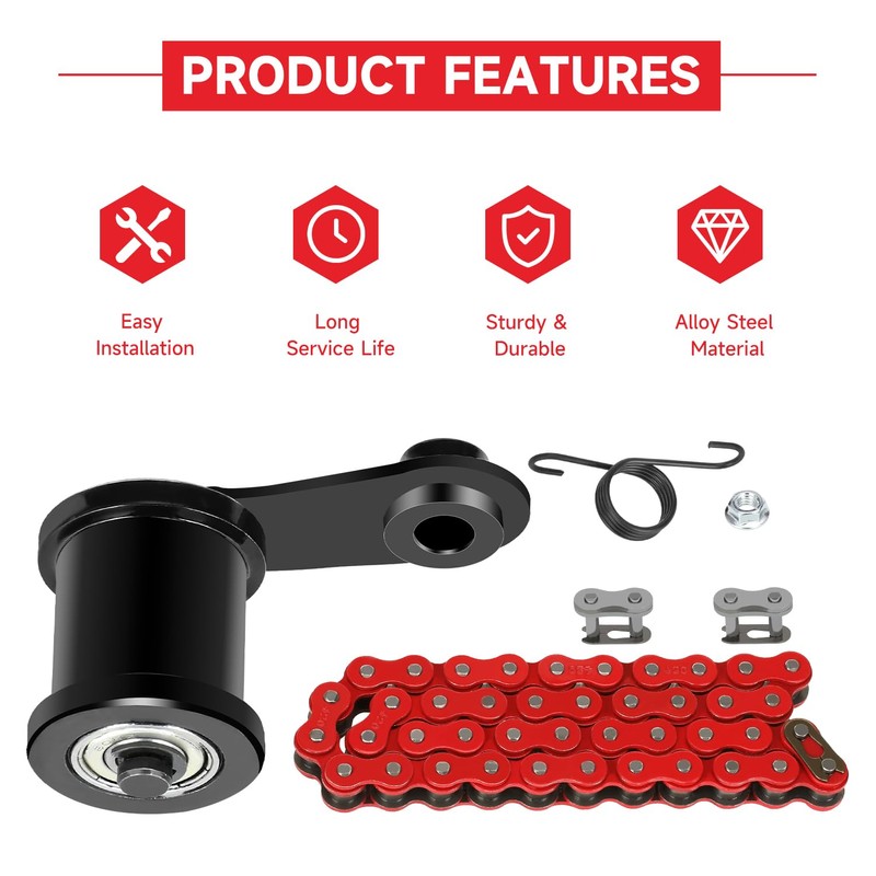 • Easy Installation: The kit includes a chain tensioner and 420 roller chain 42 links, along with dedicated springs and 420 chain master links, reducing the hassle of purchasing separately. At the same time, installation and disassembly can be quickly completed without additional tools, and you can enjoy a smooth riding experience immediately after installation