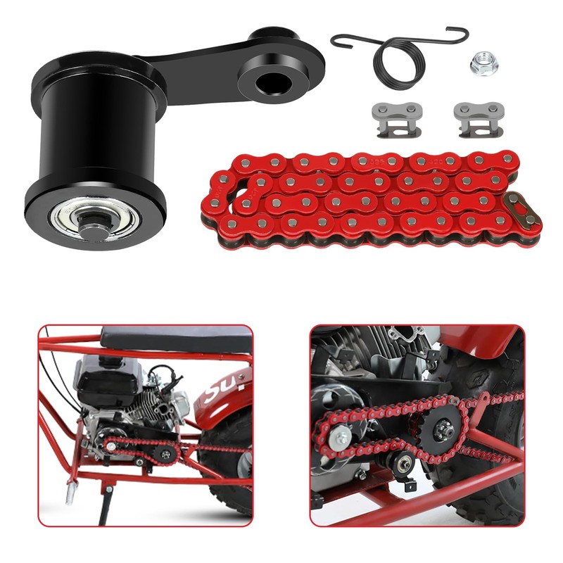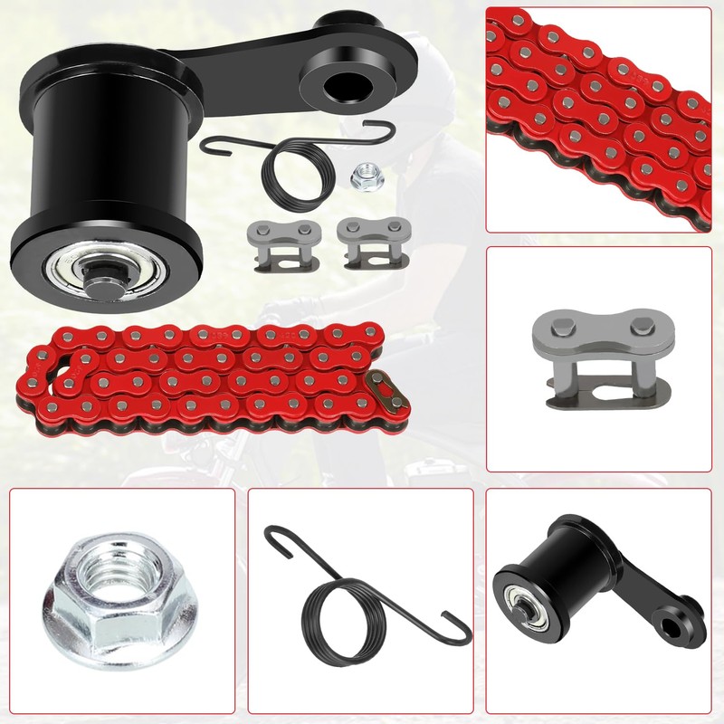 • Package Includes: 1* Mini bike chain tensioner, 1* 42 Link 420 chain, 2* Chain master links, 1* Spring, 1* Nut