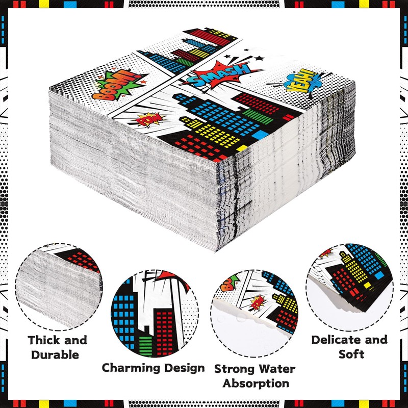- Large Capacity Set: Package contains 100 Pcs 2-ply super theme hero napkins, plenty enough to meet your needs for celebrations and party decorations. Each napkin folded size is about 6.5 x 6.5"/16.5 x 16.5cm, unfolded size is about 13 x 13"/33 x 33cm, this size is suitable for all kinds of venues, won't take up too much space for storage