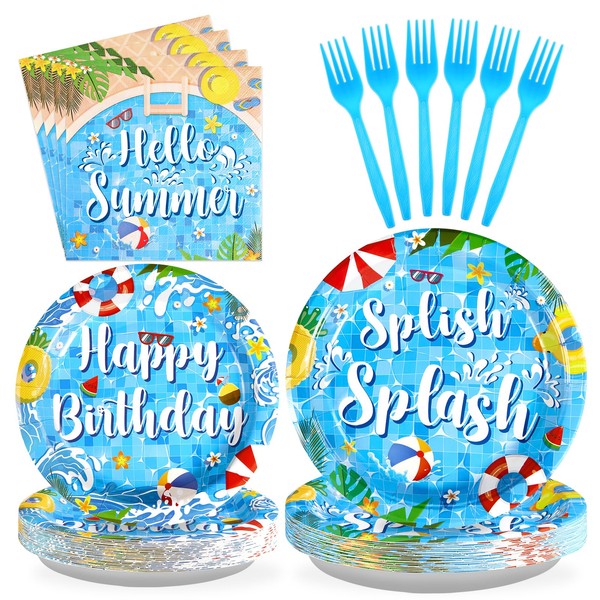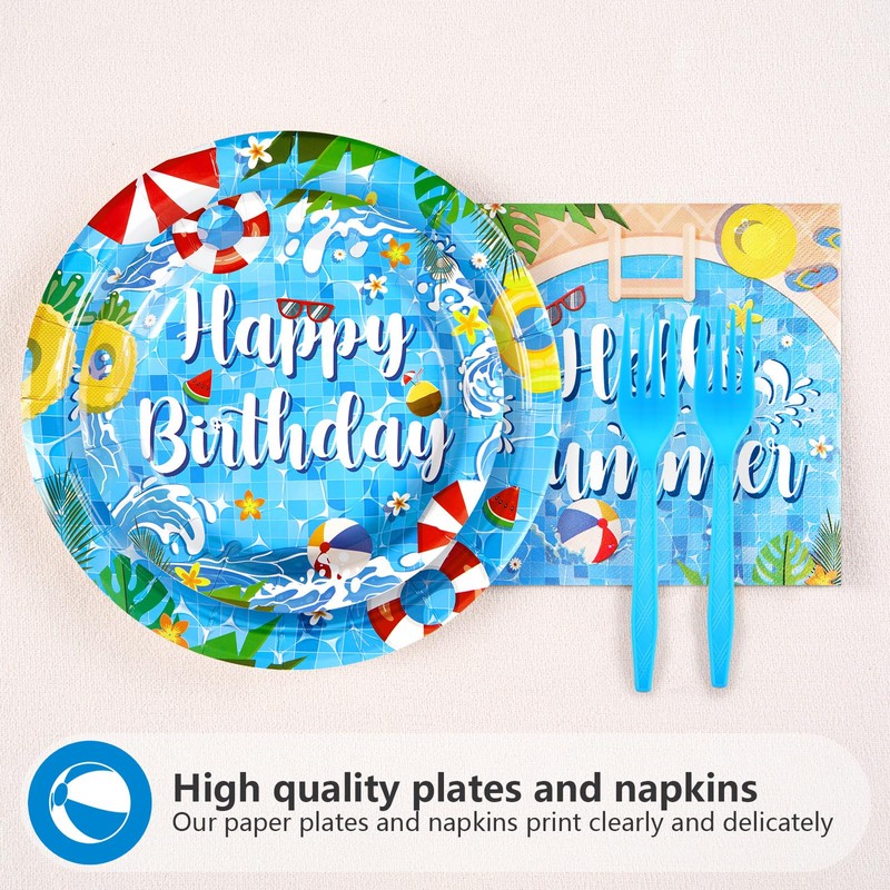 - Package includes: You'll get 24 pieces of 9in splish splash party paper dinner plates, 24 pieces of 7in pool party dessert plates, 24 pieces of summer pool napkins 6.5in, and 24 pieces of plastic blue forks for each set that can serve 24 guests, creating a visually stunning table decor for your birthday party