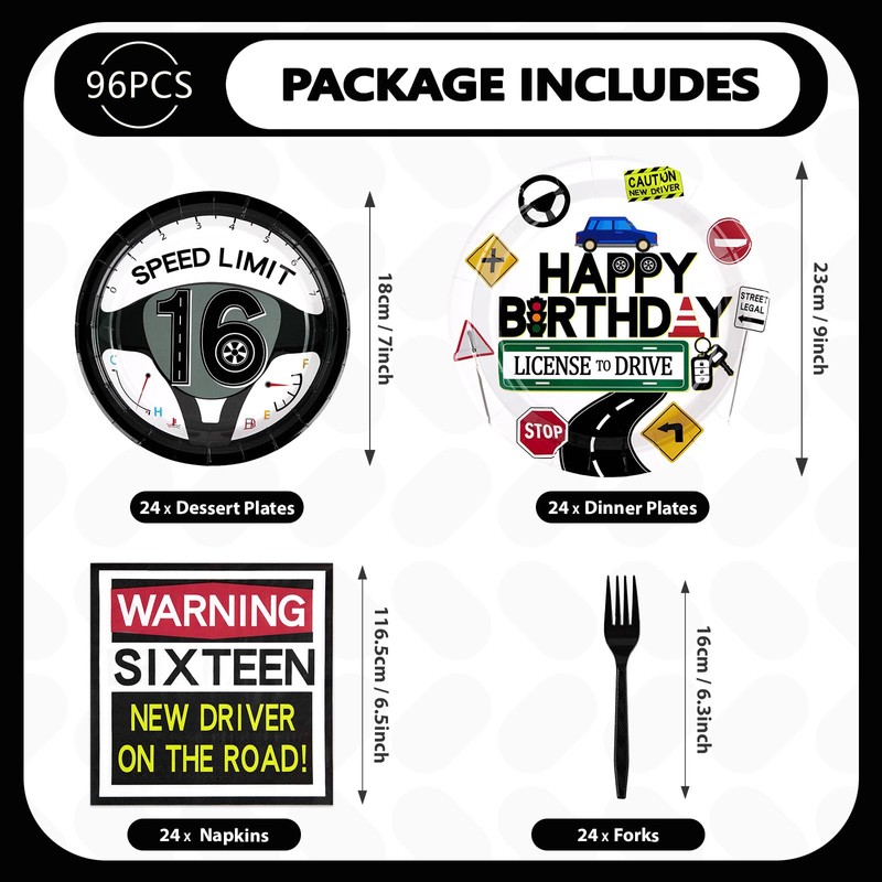 - 【Drivers License 16th Birthday Party Supplies】Drivers license sixteen years old party decorations flatware set includes 24pcs 9'' drivers license paper plates, 24pcs 7'' drivers license paper plates, 24pcs drivers license paper napkins, 24pcs disposable forks.There are a total of 96 pieces in this drivers license birthday plates and napkins set,everything you need to serve up to 24 guests in style. The drivers license 16th birthday theme party supplies enough to hold a different and unique party