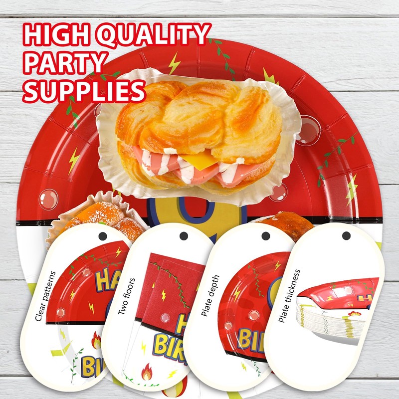 - Red White Yellow Design: The 9th birthday plates and napkins birthday decoration are designed with red white yellow inspired by cartoon, multiple combinations of cartoon an anime elements. These anime cultural elements will add a different atmosphere to your party. Specially designed for the birthday of 9 year old kids, Immerse them in a world full of cartoon party, surrounded by their favorite party decorations