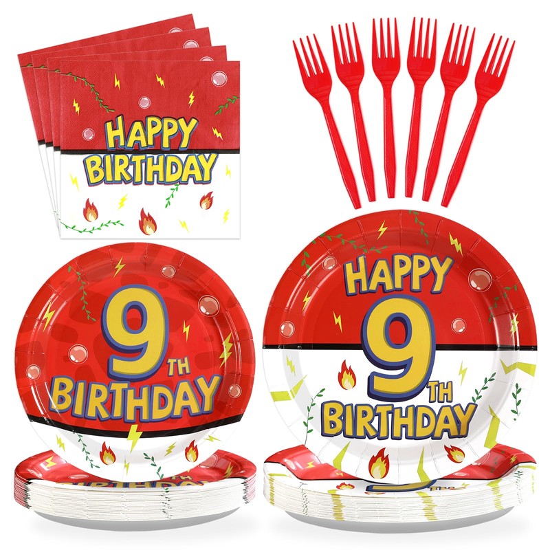 - 9th Birthday Tableware Set: Our 96 piece happy birthday paper plates sets includes 24 9inch happy 9th birthday on dinner plates, 24 7 inch birthday dessert plates, 24 6.5 inch happy birthday napkins, and 24 red forks, each set can accommodate 24 guests. This ball theme birthday party is designed specifically for a 9 year old kids birthday and will bring children the perfect birthday party experience