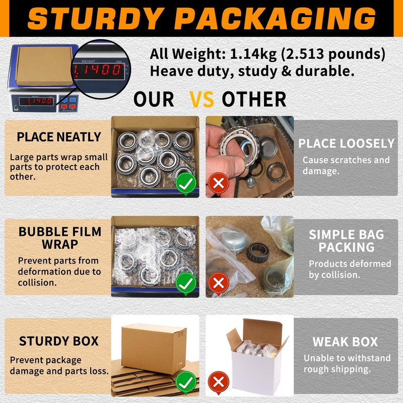 - 【STURDY PACKAGING】- The trailer bearing kits are wrapped in a sturdy cardboard box with bubble wrap. All parts are placed neatly. The products are protected as much as possible during transportation to prevent deformation and wear.