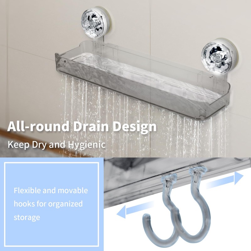 - 4. BOTTOM DRAIN: The bottom drain holes of the shower organizer corner are designed to maximize ventilation and drainage to keep your bath products clean and dry, and to prevent bacterial growth. The shower shelf suction cup are detachable and have slots on the back. You can also take this caddy organizer out for cleaning or other purposes.