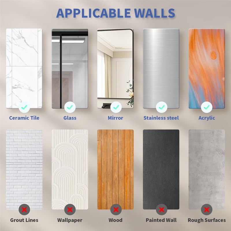 - 5. PUNCH-FREE INSTALLATION: No drilling, no tools, 1 second installation, clockwise rotation to 3-5 o'clock position, adsorption is very easy to install. This acrylic shower caddy is best suited for non-porous, impermeable smooth surfaces such as glass, mirrors, polished mecha, stainless steel, etc., and is not suitable for uneven tiles, textured boards, wallpaper, painted walls, etc.