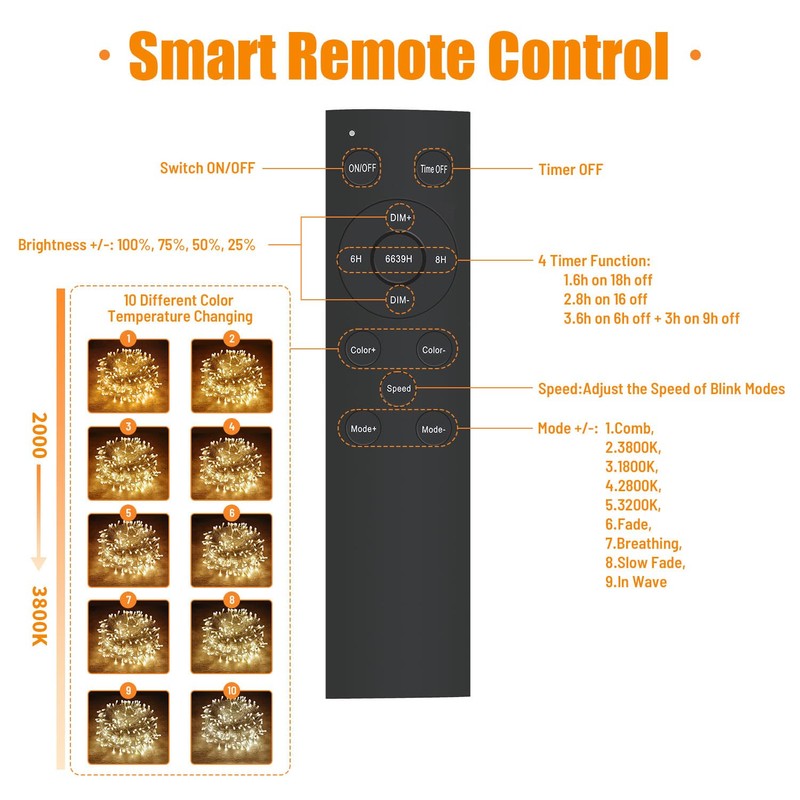 - 【10 Color Temperature Adjustable 2000-3800K】The outdoor fairy lights have 10 adjustable color temperatures (from 2000K to 3800K). From warm yellow light to relative white light, light in these color temperature ranges can create different atmospheres and effects for different environments and activity needs. Lower color temperatures (e.g. 2000K-2800K) are suitable for places that need to be warm and relaxing, such as bars, cafes, restaurants, living rooms, home cinemas and beauty salons. While higher color temperatures (e.g. 3500K-3800K) are suitable for places that need to be bright and focused, such as auditoriums, kindergartens, classrooms and libraries.