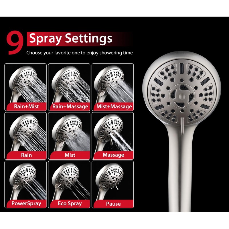 The detachable handheld shower head has 9 spray settings such as Rain, Mist, Massage, PowerSpray, Eco Spray,Rain+Mist, Rain+Massage, Mist+Massage and Pause. You can switch to find best one for your daily use.