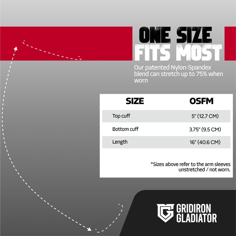 - One Size Compression: With our one-size-fits-most design, these arm sleeves offer form-fitting compression that can help improve blood flow, reduce muscle fatigue, and support muscle recovery.