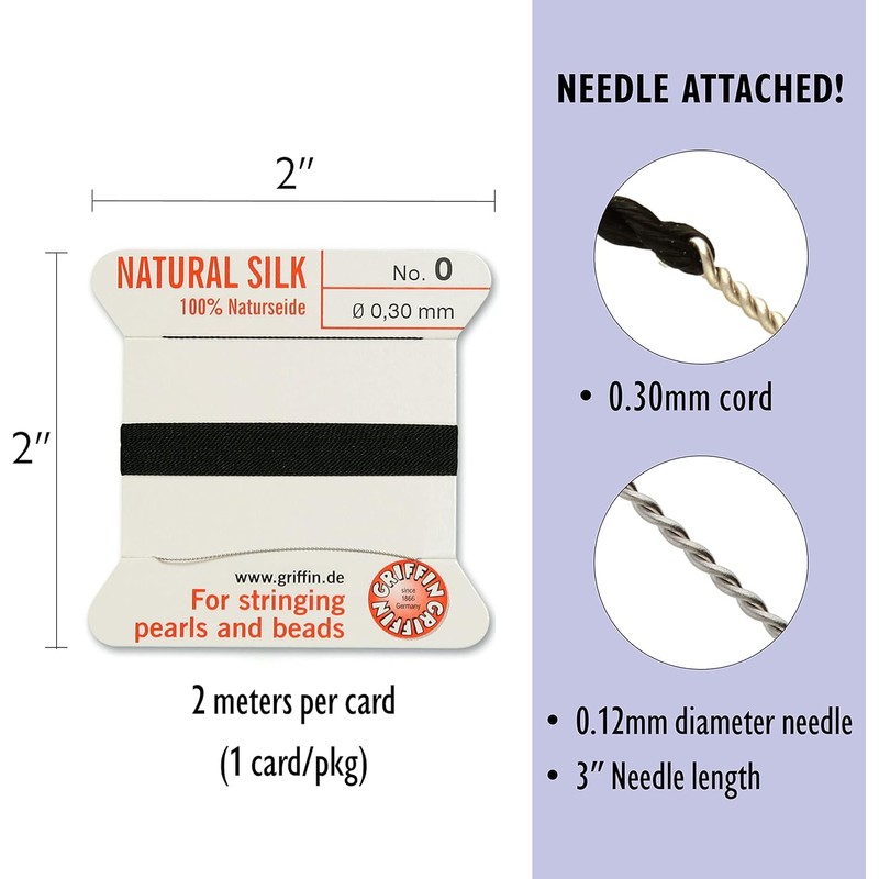 - Each card features top-quality German-made Griffin bead cord. This is the finest quality tight-woven silk cord available with 6.5 feet (2 meters) of brilliantly died, color-fast cord per card with needle attached. Simply take the needle from the card and off you go! The twisted stainless steel needle saves threading time. Doubling the thread is not necessary. There is no simpler, no quicker, and no better way to thread beads.