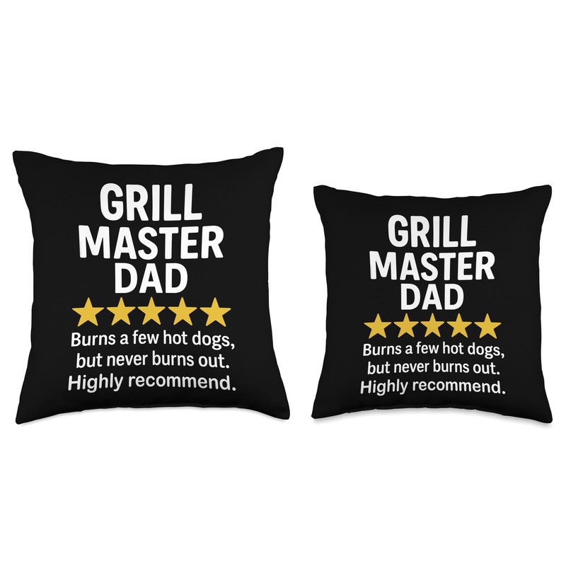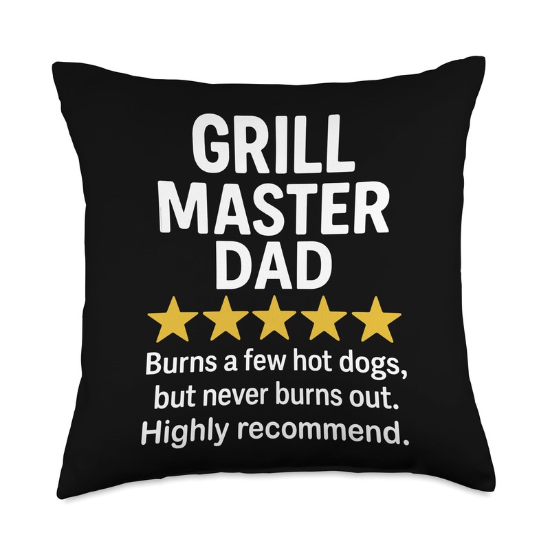 - This design features bold white text that reads "Grill Master Dad" above a five-star graphic rating. Beneath it, the caption humorously states: “Burns a few hot dogs, but never burns out. Highly recommend.” The layout is clean and impactful, with