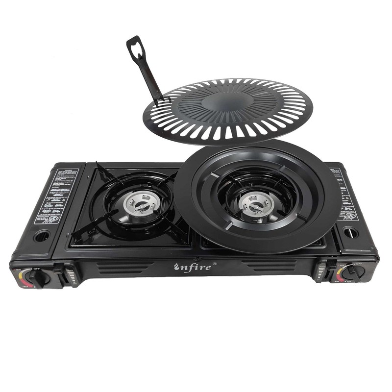 - Box contents: you will receive the grill attachment (without gas cooker and gas cartridges). The gas cooker and the matching gas cartridges are available separately at WEST&EAST. Turn your camping stove into a flexible and flat grill plate in no time at all. Don't hesitate, the barbecue season is in full swing