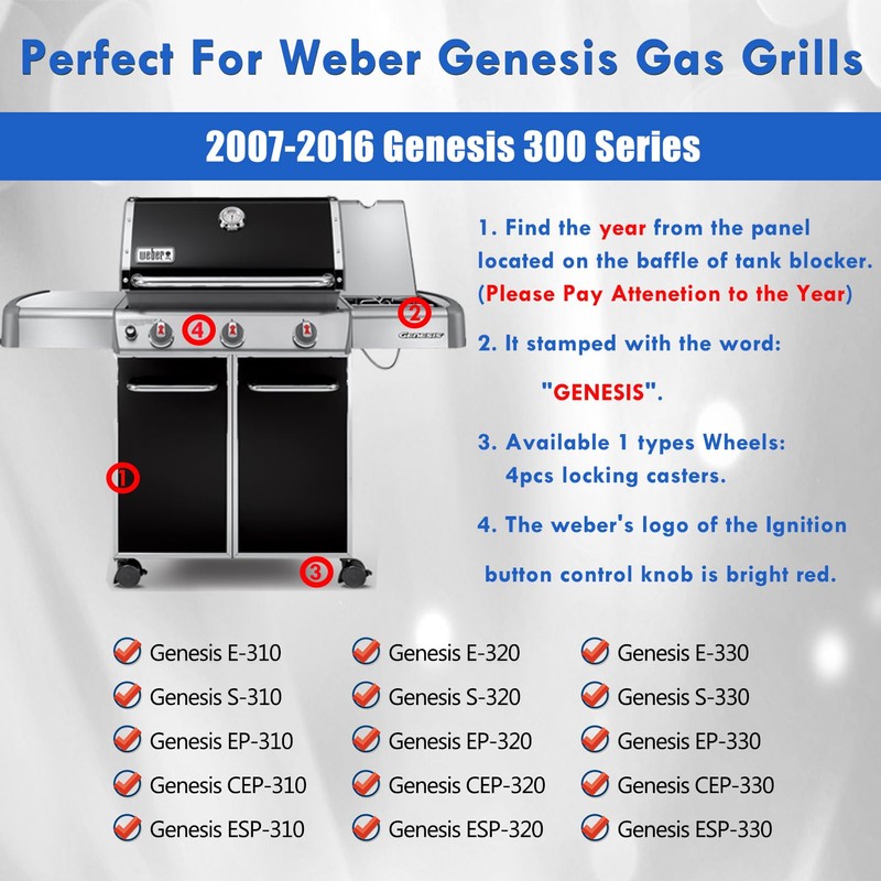 - 【Fits 2007-2016 Weber Genesis 300 Series Grills】 Weber genesis e-310, genesis s-310, genesis e-330, genesis s-330, genesis ep-310, genesis ep-330, genesis cep-310, genesis cep-330, genesis esp-310, genesis esp-330, genesis e-320, genesis s-320, genesis ep-320, genesis cep-320, genesis esp-320 grills with front control. 【Please Note that Not Fits 2017+ Weber Genesis II & II LX 300 Grills OR 2022+ GENESIS 300 GRILLS, Please Check The Year of Grill Before Order.】