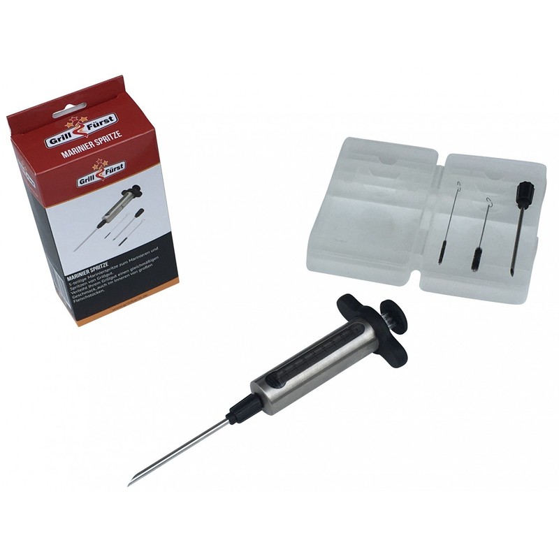 - Box contents: the storage box contains 1 marinating syringe, 1 needle attachment with 4 mm diameter, including cleaning brush and 1 needle attachment with 2 mm diameter, including cleaning brush.